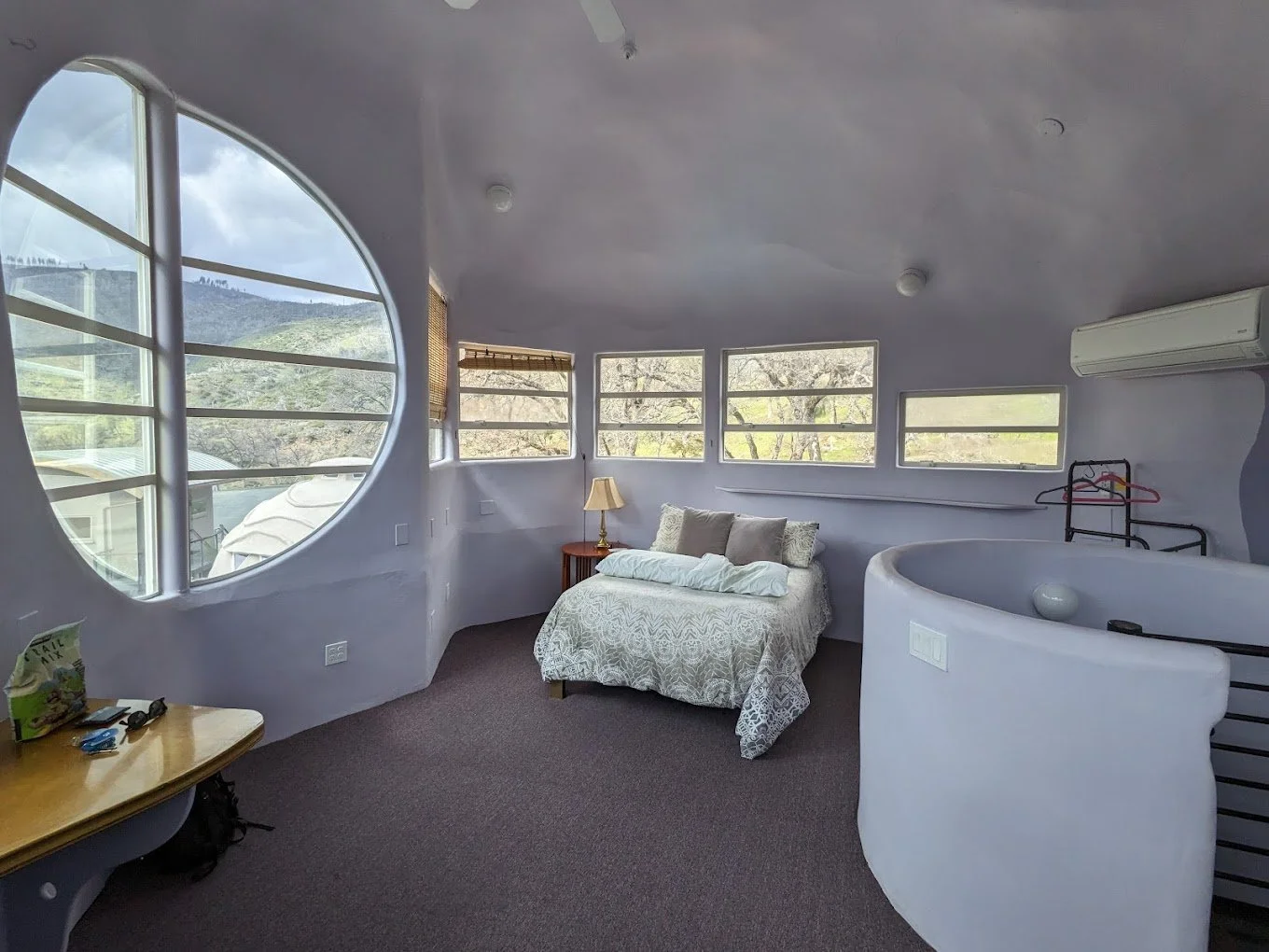 On a majestic hillside overlooking the forested ravine and mountains of northern California sits a most unusual building. It is a special school of massage that is performed in water. Harold Dull, the inventor of this system, has built a school which features five 8.5 to 10 meter diameter spheres formed in wood, and sheathed in stucco cement and waterproof vinyl composite. A waterfall seemingly connects two outdoor pools, with a cave behind it. The spheres contain classrooms, commercial kitchen, offices, sleeping quarters, residential quarters, and a three-story studio. Fireproofing is created by a series of outdoor sprinklers at the center roof of each sphere. In case of fire the spheres are immediately immersed in water becoming impenetrable to fire. At the base of each sphere is a water trough of moving cold water that naturally cools the air around the sphere. Small tubular openings contain solar-powered fans that draw the water-cooled air in and push hot air out the roof top openings; creating a natural, continuous air exchange system. Recycled paper pulp mixed with water-based glue is sprayed into the open structural cavities of the walls to provide excellent insulation. The spherical shape–minimizing surface area while maximizing volume covered and structural strength–has proven itself to maintain a cool interior temperature even when the outside temperature reaches beyond 42 degrees Celsius, and even without the insulation put in. The spherical shapes also activate wind flow to further cool the buildings. They are also extremely durable and stable; easily able to resist earthquake forces acting upon them. In fact, it has been proven that the sphere is the strongest most efficient shape in the universe. Every detail of the building is unique including the stone retaining walls in which the rocks seem to grow straight out of the wall with brilliant glass marbles placed between the stones. The floors too are made of silver quartzite flagstone with flattened glass marbles of iridescent and transparent quality shimmering in the floors. This is a one-of-a-kind building open to public tours and visited by millions of persons from around the world.