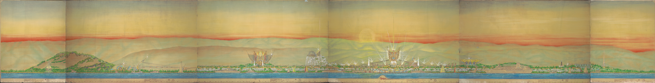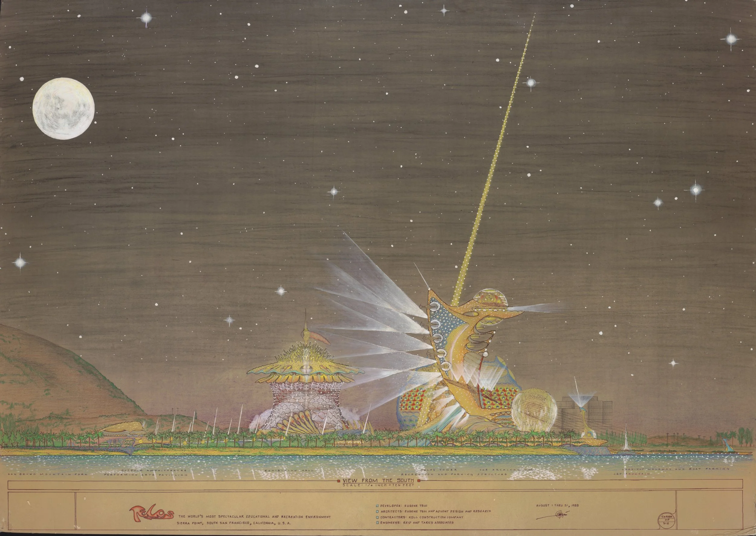 “The World’s Most Spectacular Education/Technology/Recreation Park.” Proposed to Y.H. Chen, Tuntex Corporation, Taipei, Taiwan. This 900 acre track of land overlooking the San Francisco Bay in northern California was proposed this unprecedented theme park design that housed the world’s most far-reaching ideas in every field of human endeavor; from education to the design of lunar cities; from new garden tools to the transformation of science and technology; this theme park is a step into the incredible mind of nature and human kind as collaborators and caregivers of the planet earth.”